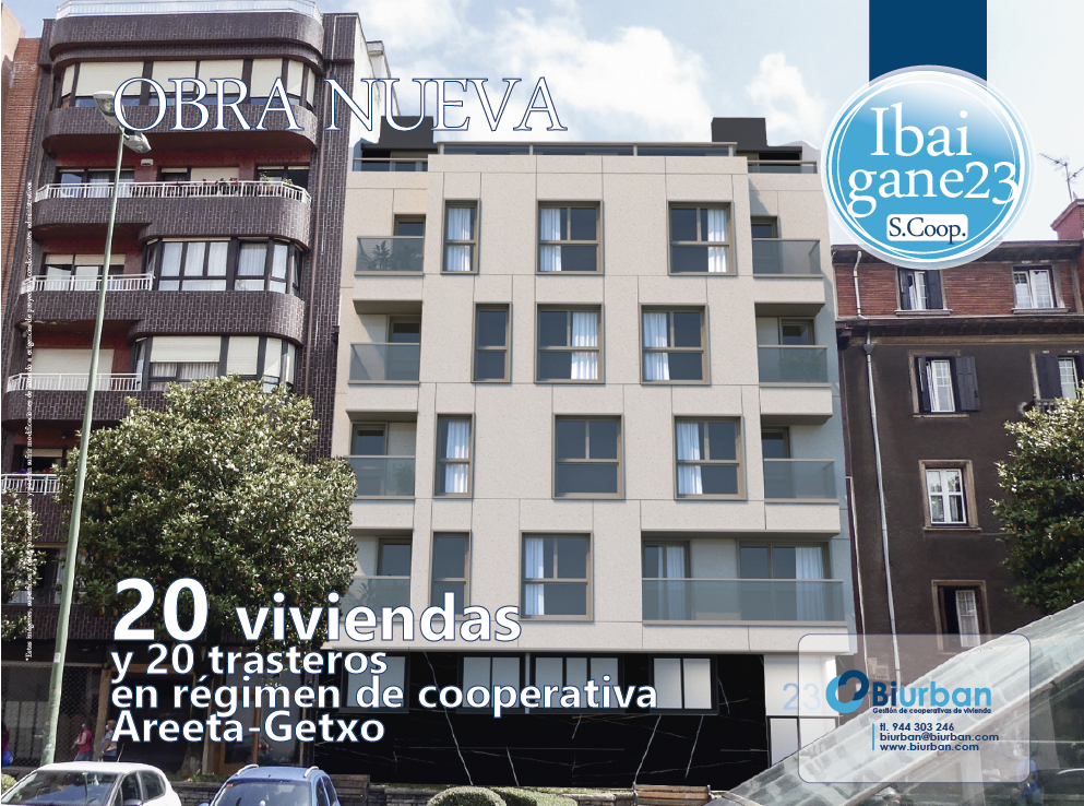 En una fantástica ubicación, en una céntrica calle de Las Arenas, Ibaigane 23, a un paso de la boca del Metro, de la plaza de la Ajedrez y con todos los servicios a su alcance, se van a construir 20 viviendas de 1,2 y 3 dormitorios, con trasteros en régimen de Cooperativa.